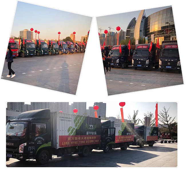 振宇物流積極捐贈圖書,爲愛護航 ,通過自己的方式和力量,助力百萬圖書大漂流!現場物流車輛整齊排開,氣勢如虹……