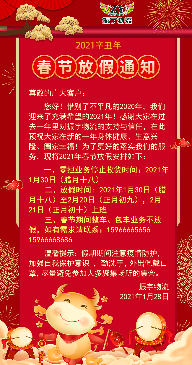 您好!惜别瞭(le)不平凡的2020年,我們迎來瞭(le)充滿希望的2021年!感謝大家在過去一年裏對(duì)振宇物流的支持與信任,在此預祝大家在新的一年身體健康、生意興隆、阖家幸福!爲瞭(le)更好的落實我們的服務,現将2021年春節放假安排如下: