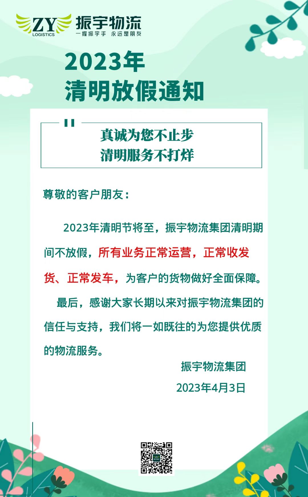 2023年清明節(jié)将至,振宇物流集團(tuán)清明期間不放假,所有業務正常運營,正常收發貨、正常發車,爲客戶的貨物做好全面保障。最後,感謝大家長(zhǎng)期以來對(duì)振宇物流集團的信任與支持,在此祝您度過(guò)一個(gè)愉快的假期。