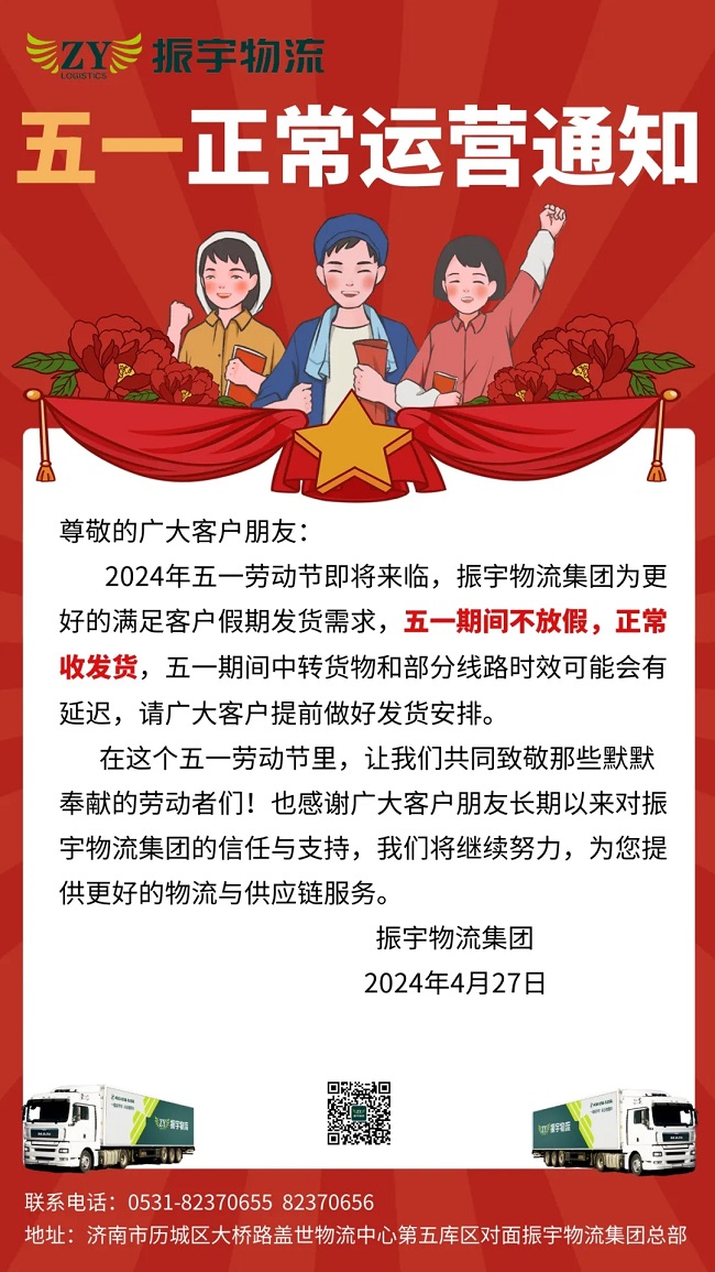 2024年五一勞動節即将來臨,振宇物流集團爲更好的滿足客戶假期發貨需求,五一期間不放假,正常收發貨 ,五一期間中轉貨物和部分線路時效可能會有延遲,請廣大客戶提前做好發貨安排。