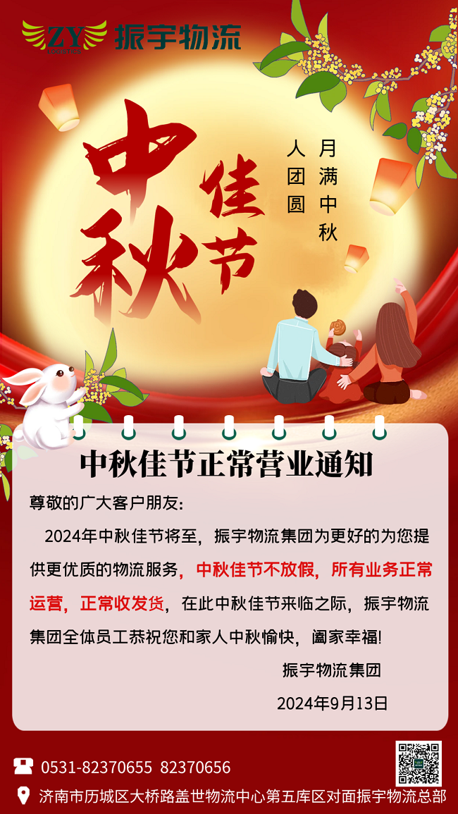 2024年中秋佳節将至,振宇物流集團爲更好的爲您提供更優質的物流服務,中秋佳節不放假,所有業務正常運營 ,正常收發貨,在此中秋佳節來臨之際,振宇物流集團全體員工恭祝您和家人中秋愉快,阖家幸福!