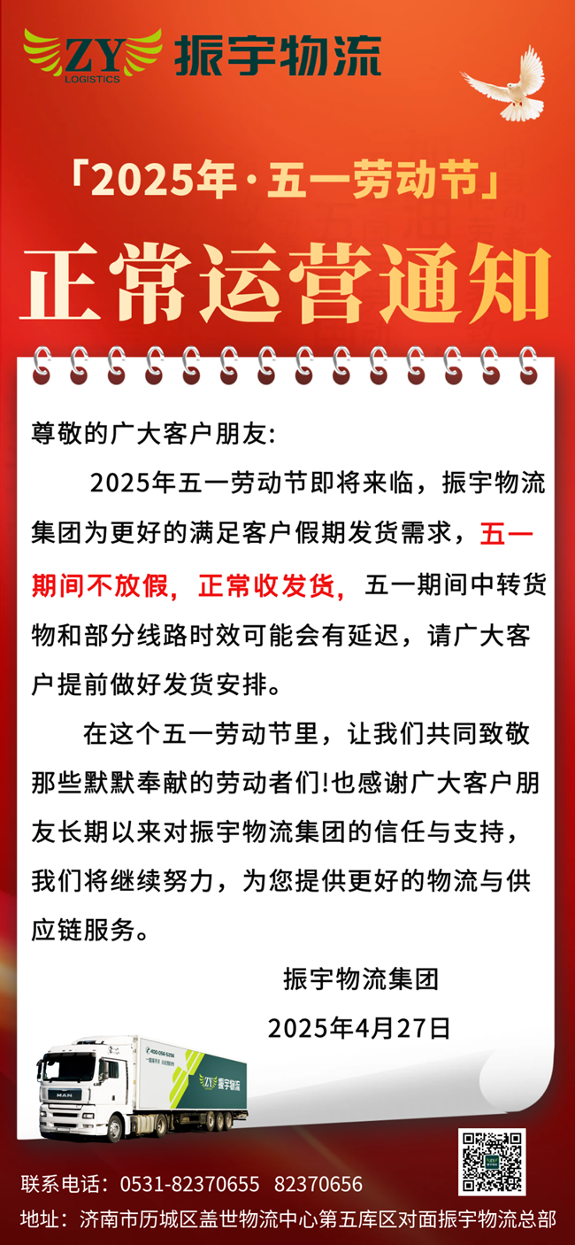 2025年五一勞動節即将來臨,振宇物流集團爲更好的滿足客戶假期發貨需求 ,五期間不放假,正常收發貨,五一期間中轉貨物和部分線路時效可能會有延遲,請廣大客戶提前做好發貨安排。