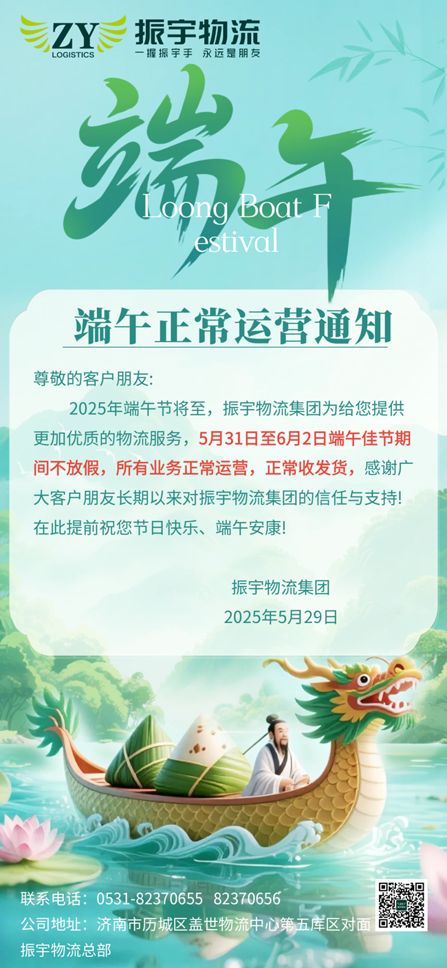 2025年端午節将至,振宇物流集團爲給您提供更加優質的物流服務 ,5月31日至6月2日端午佳節期間不放假,所有業務正常運營,正常收發貨,感謝廣大客戶朋友長(zhǎng)期以來對(duì)振宇物流集團的信任與支持!在此提前祝您節日快樂、端午安康!