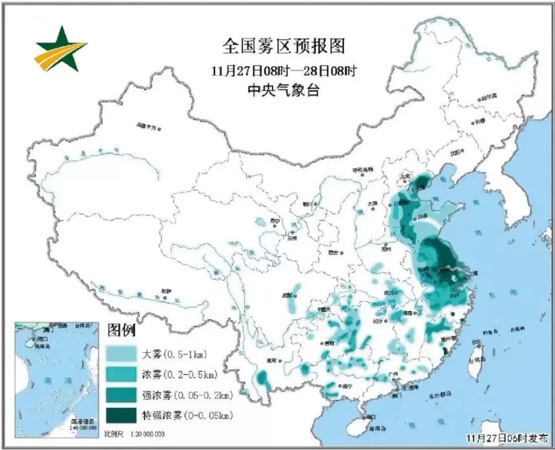 中央氣象台11月27日06時繼續發(fā)布大霧橙色預警,27日早晨至28日早晨 ,華北中東(dōng)部、黃淮東(dōng)部和南部、江淮、江漢平原的部分地區将有大霧,其中河北東部、山東西南部、安徽東部、江蘇、上海、浙江北部等地有濃霧或強濃霧,局地有能見度不足50米的特強濃霧。預計華東地區的大霧天氣會一直持續到12月2日,長(zhǎng)達(dá)一周。