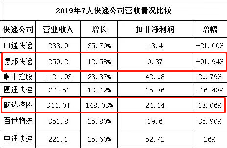 而根據德邦股份發布瞭(le)2019年業績報(bào)告,2019年實現營業收入259.22億元,同比增長12.58%;實現歸屬上市公司股東淨利潤3.24億元,同比下滑53.82%。扣非淨利潤下降-91.94%。在虧損的邊緣徘徊。