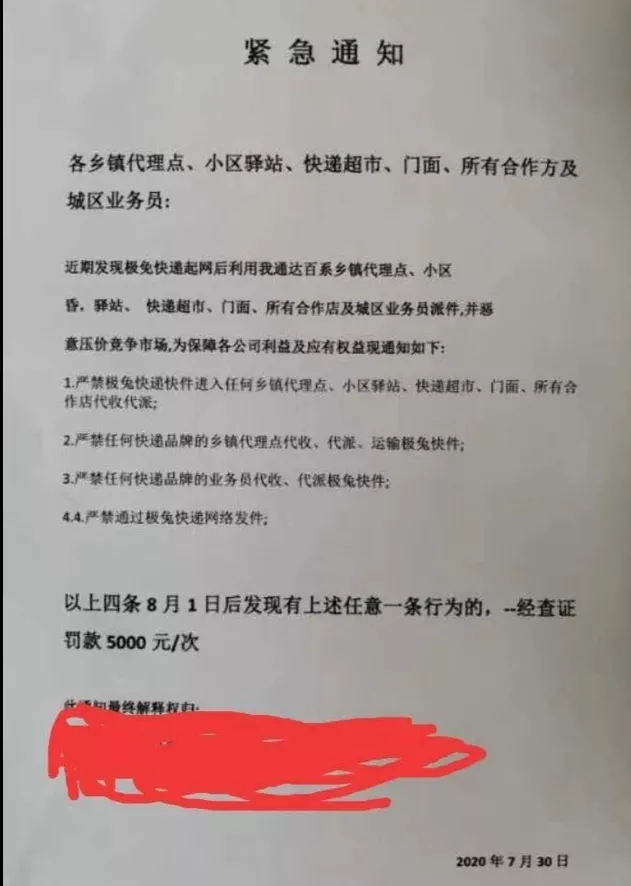 7月底,有某通達(dá)系快遞(dì)總部下發通知,要求全網各網點禁止代理極兔速遞(dì)業務,通知指出,攬派兩端加盟公司不得以任何理由、任何形式代理極兔速遞(dì)業務。還有通知指出,如果通達(dá)百系中鄉鎮代理點、小區、驿站、快遞(dì)超市等業務員因惡性低價競争攬收極兔速遞(dì)的,經(jīng)查證,每次予以5000元罰(fá)款。