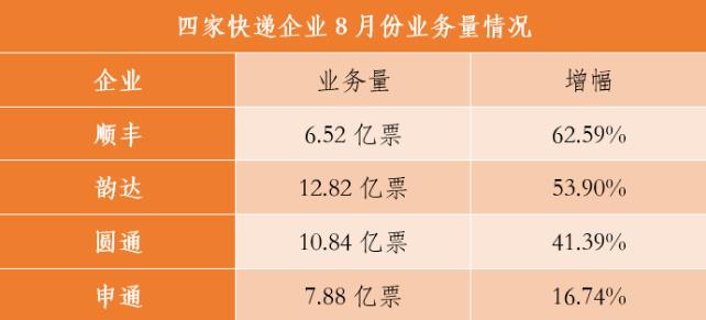 9月18日晚間,順豐控股、圓通速遞、韻達(dá)股份和申通快遞四家企業發布8月經營簡報(bào)。數據顯示,四家快遞企業繼續保持高速增長(zhǎng)。其中,順豐業務量增幅繼續領跑,韻達(dá)連續五個月、圓通連續四個月單月業務量破10億票。