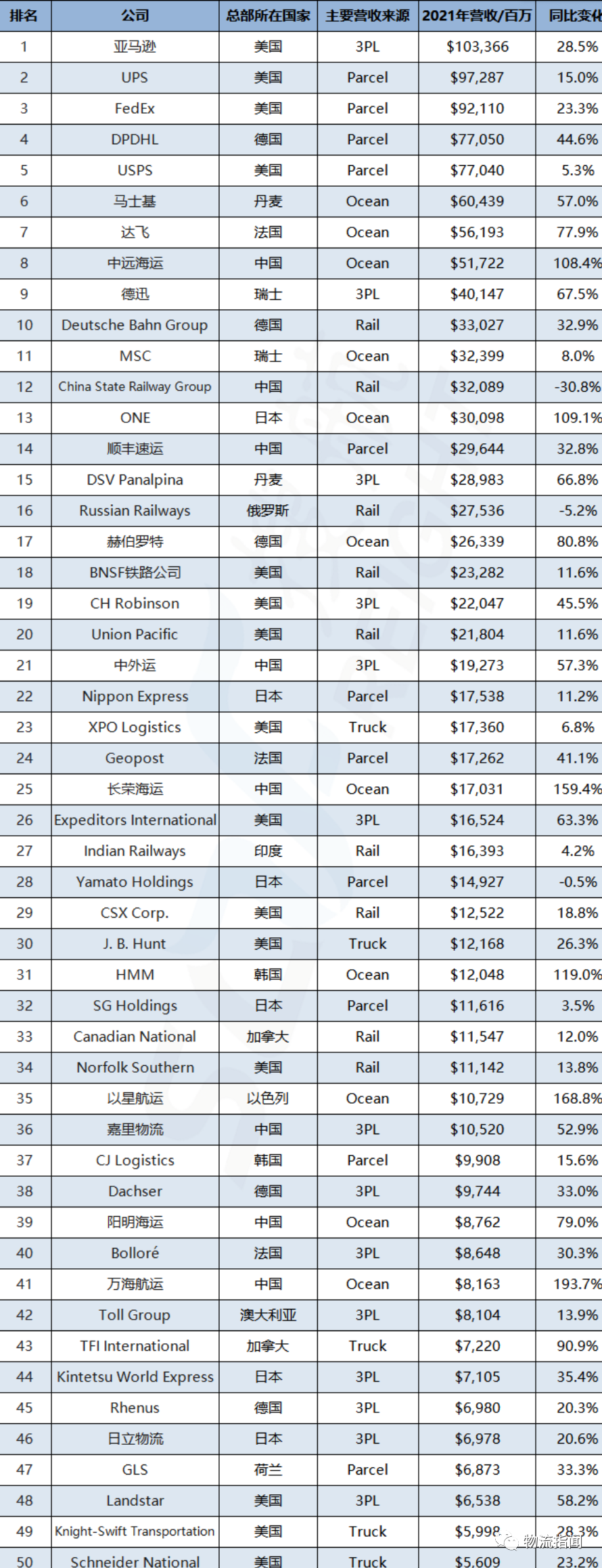 據瞭(le)解,全球50大運輸供應商2021年的總收入達到瞭(le)1.29萬億美元,同比增長(zhǎng)31.4%,創曆史新高。50家企業中有47家實現瞭(le)年度增長(zhǎng)。