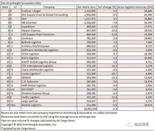 7月11日消息,第三方物流咨詢機構Armstrong&Associates.Inc發布瞭(le)最新的2022年航空貨代TOP25排名。前25家空運貨代公司的總貨量同比下降瞭(le)6.3%,達到1690萬噸。其中,前五名延續去年的排名,分别爲德迅(K+N)、DHL、DSV、DB Schenker、Expeditors。德迅憑借223萬噸的空運貨量,進一步擴大瞭(le)對DHL的領先優勢,再次成爲全球最大航空貨運代理公司。排名第二的DHL去年空運貨物量下降瞭(le)9.3%,達到190萬噸,反映出瞭(le)整體空運貨代市場(chǎng)的情況。