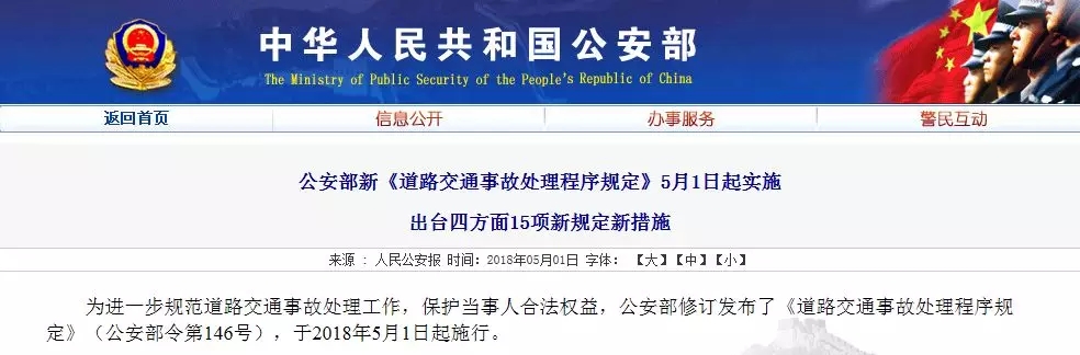 爲進一步規範道路交通事故處(chù)理工作,保護當事人合法權益,日前,公安部修訂發布瞭(le)《道路交通事故處(chù)理程序規定》(公安部令第146号),該(gāi)規定已於(yú)2018年5月1日起正式施行。