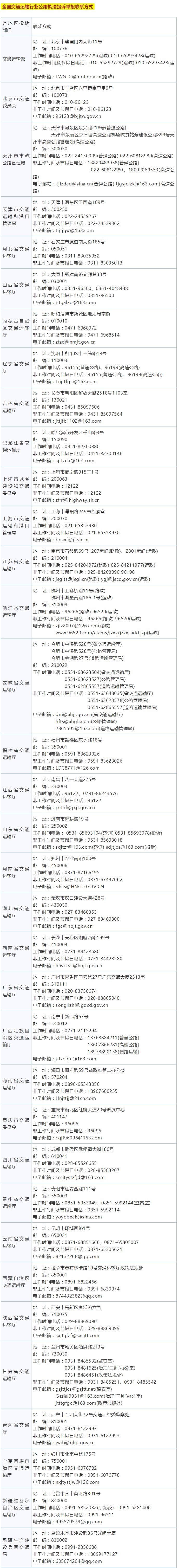交通運輸部公路局、道路運輸司聯合向社會集中公布全國交通運輸行業公路執法行風投訴舉報(bào)電(diàn)話、通信地址和電(diàn)子郵箱地址。