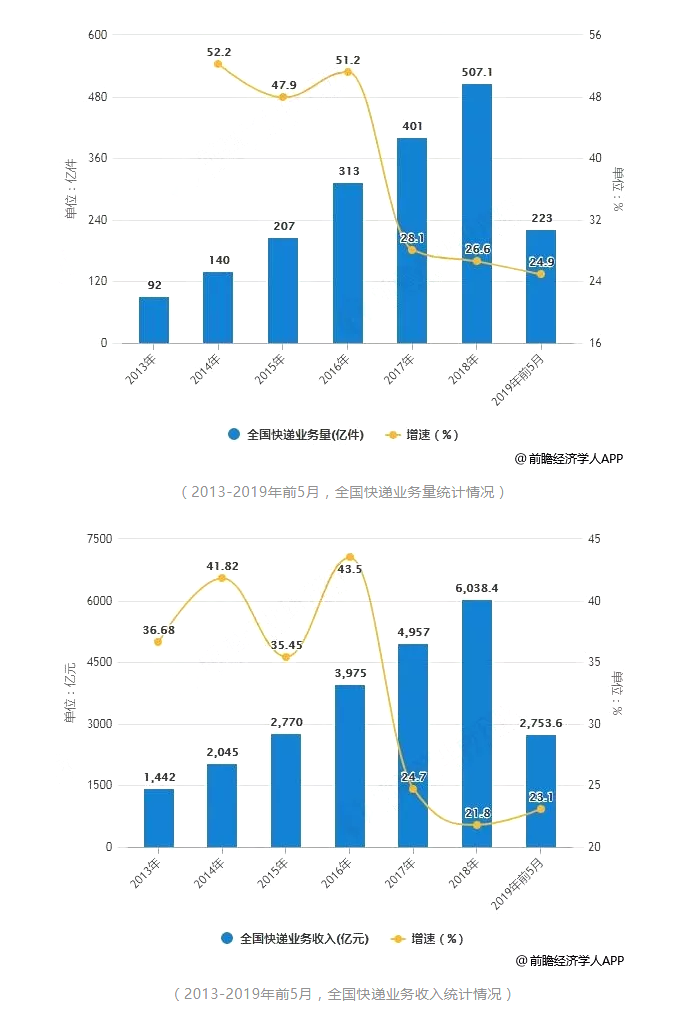 2019年上半年已經過去,從(cóng)前5個月的情況來看,在全行業業務量增長(zhǎng)24.9%的情況下,主要快遞上市公司業務量保持著(zhe)30%以上的增速,行業集中度不斷(duàn)提高。